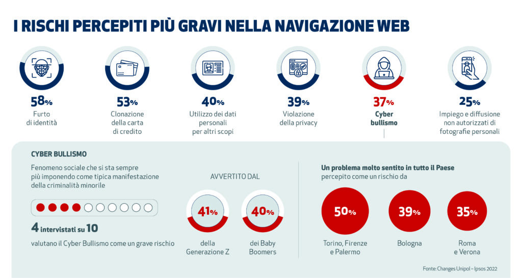Un capitolo a parte merita il cyberbullismo. Secondo dati di Changes Unipol-Ipsos ben 4 intervistati su 10 valutano il cyberbullismo come un grave rischio, avvertito, soprattutto dalle donne (43%) e in egual misura nelle diverse generazioni, dal 41% della Generazione Z così come dal 40% dei Baby Boomers. Un problema molto sentito in tutto il Paese, con Torino, Firenze e Palermo che mostrano le maggiori preoccupazioni (50% degli intervistati lo indicano come un rischio), meno invece a Bologna (39%), Roma e Verona (35%).
