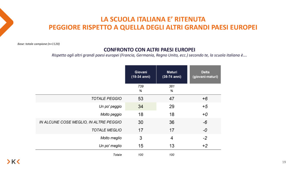 Questa interpretazione è in parte condivisa dai giovani italiani: il 42% di essi è infatti insoddisfatto dell’istruzione ricevuta, contro il 32% dei maturi. Anche nel confronto con l’Europa la scuola italiana, a loro dire, non ne esce bene: oltre metà (53%) ritiene che essa sia peggiore rispetto a quella degli altri grandi paesi europei.