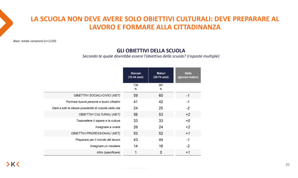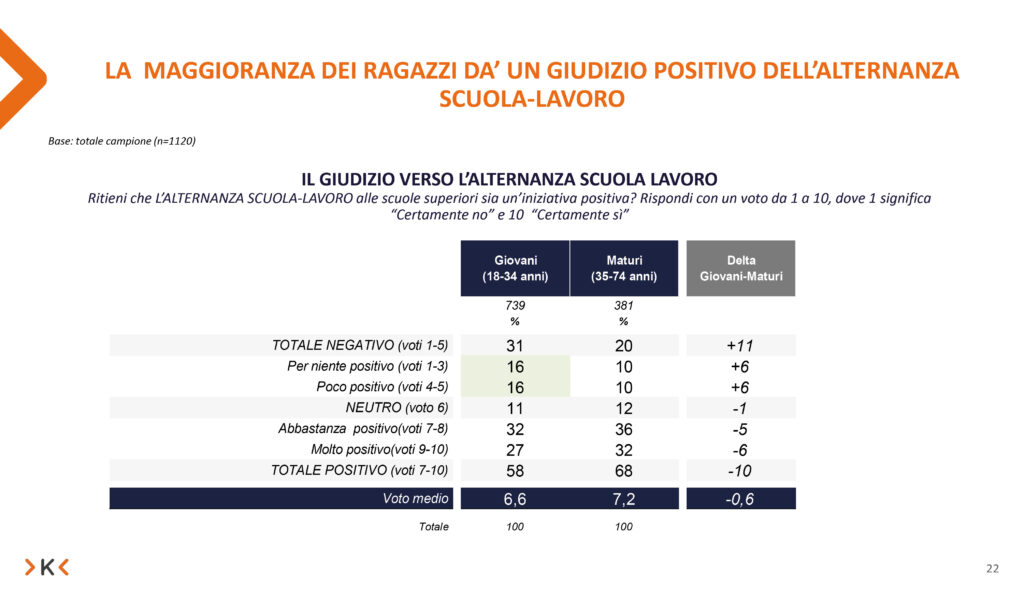 Secondo i giovani, attualmente l’obiettivo meno raggiunto è l’ultimo. Proprio per questo, le iniziative che avvicinano gli studenti al mondo del lavoro (come l’alternanza scuola lavoro) sono accolte positivamente dalla maggior parte (58%).