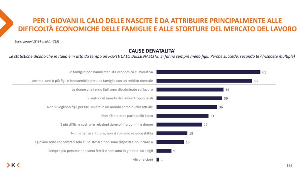 La verità che ci consegnano i ragazzi è semplice e dura: se si fanno pochi figli è principalmente perché le famiglie non hanno stabilità economica e lavorativa (61%) e il costo di uno o più figli è insostenibile per una famiglia con un reddito normale (56%).