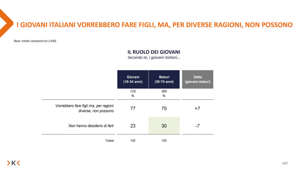 L’indagine sui giovani ci dà la possibilità di fare un po’ di chiarezza, integrando nei nostri ragionamenti il punto di vista dei protagonisti, ovvero di chi è deputato biologicamente a garantire la continuità della famiglia (e della specie), ma non lo fa come ci si aspetterebbe.