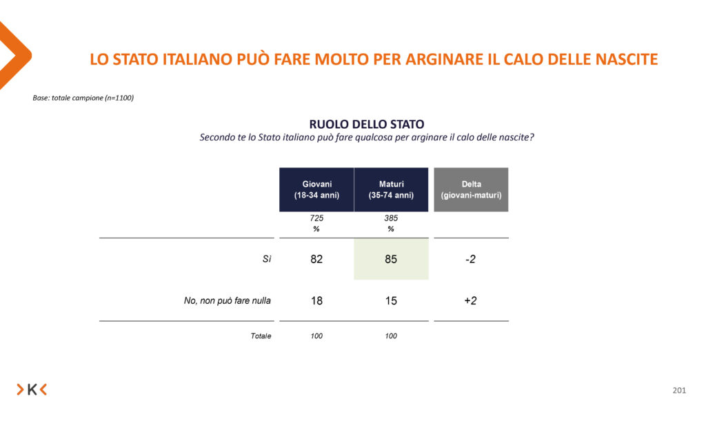 Lo Stato può fare qualcosa? Certamente sì (82%). Può dare incentivi economici alle famiglie (74%), rendere più semplice conciliare lavoro e famiglia (65%), tutelare maggiormente la maternità e la paternità (58%), arginare la discriminazione verso le donne (55%).