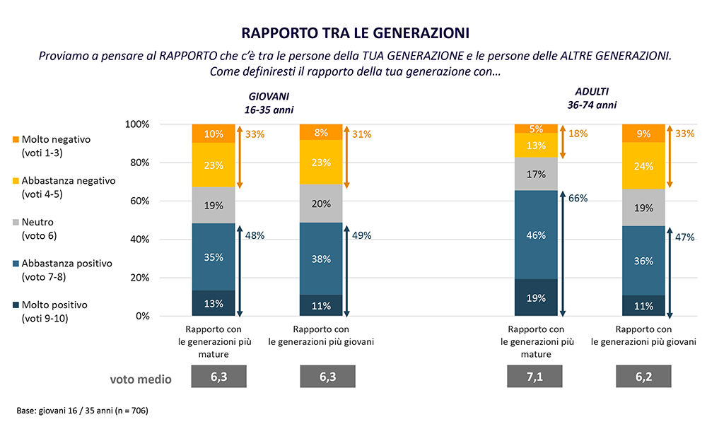 Su una scala da 1 a 10 Gen Z e Millennials valutano i rapporti con la generazione adulta con un punteggio mediocre, 6.3, con una leggera prevalenza di giudizi positivi (7:10: 48%, 1:5: 33%). I giovani con un atteggiamento fortemente critico verso gli adulti però non superano il 10%. La relazione non è idilliaca ma nemmeno conflittuale.