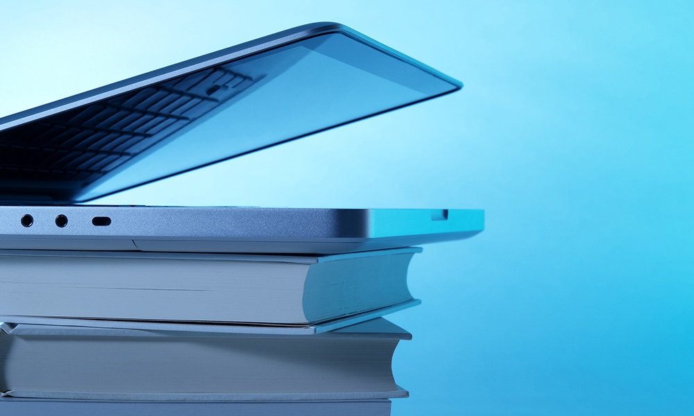 Blue tinted image of opened laptop on stacked blank books with copy space.