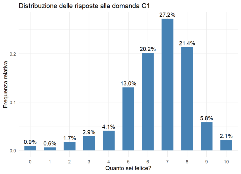 Dai dati emerge un quadro piuttosto articolato. Alla domanda “Quanto sei felice?” (su una scala da 0 a 10), la maggioranza degli italiani tende a posizionarsi nella parte alta della scala, con ben il 68,8% degli intervistati che dichiara livelli di felicità tra 6 e 8. Tuttavia, coloro che si sentono davvero molto felici (livelli 9 e 10) costituiscono solo il 7,9% del campione. Questo indica una tendenza diffusa a vivere una felicità moderata, lontana dagli estremi.