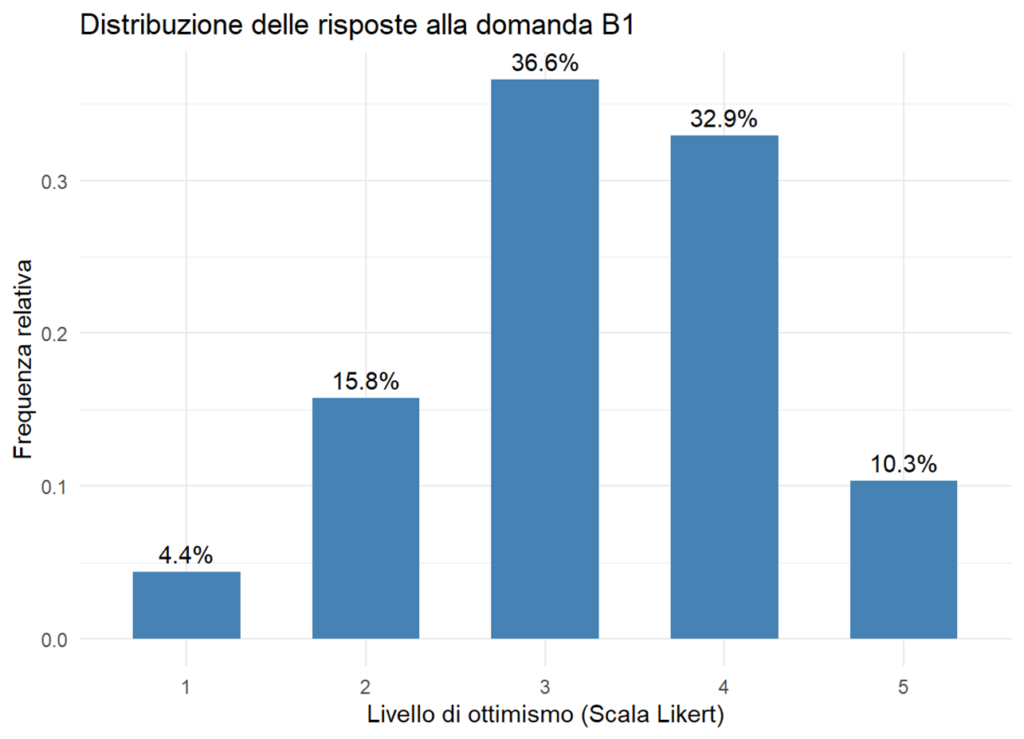 Il rapporto degli italiani con l’ottimismo appare altrettanto significativo. Il 69,5% degli intervistati si colloca nelle categorie intermedie (livelli 3 e 4 su una scala Likert da 1 a 5), mostrando una prevalenza di un ottimismo prudente. Solo una minoranza si dichiara apertamente molto ottimista (10,3%) o decisamente poco ottimista (4,4%).
