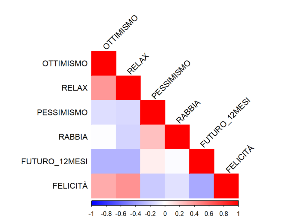 Matrice di correlazione tra felicità, ottimismo, emozioni positive e negative