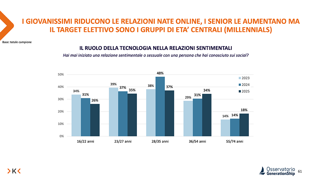 Le relazioni sentimentali sono protagoniste di un vero e proprio sconvolgimento. Già nel 2023 GenerationShip aveva parlato di «rivoluzione romantica», un cambiamento silenzioso e dirompente. che vedeva al centro soprattutto i più giovani, senza risparmiare gli adulti.