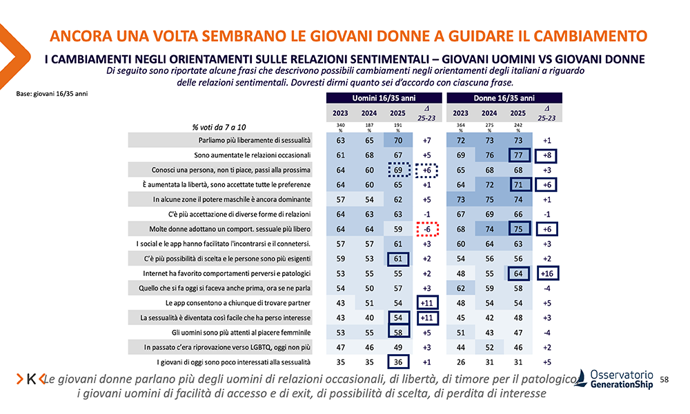 Si rafforzano anche le critiche ai cambiamenti in atto. Gli item che hanno aumentato maggiormente i consensi fra i giovani nel 2025 si riferiscono ad atteggiamenti negativi, come «internet ha favorito la diffusione di comportamenti sessuali perversi e patologici» e «la sessualità è diventata così facile che molti hanno perso interesse».