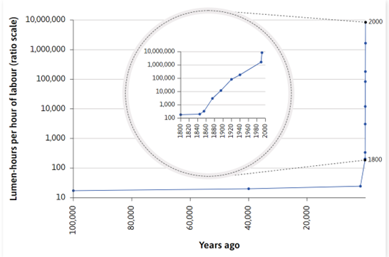 La rivoluzione industriale non è stata la fine dell’innovazione. Guardate quanto siamo più produttivi nella produzione di luce. Le nuove tecnologie hanno continuato a essere sviluppate in molti settori, tra cui la macchina a vapore, l’elettricità, i trasporti e, più recentemente, l’elaborazione delle informazioni e la comunicazione. Queste innovazioni migliorano il tenore di vita perché cambiano il funzionamento dell’economia.