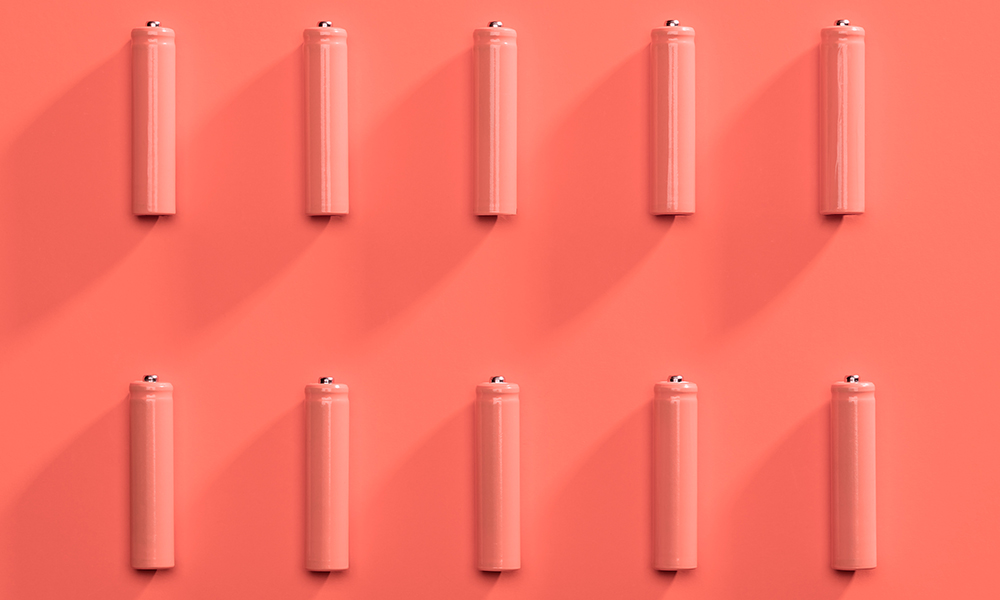 Top view of coral trendy color alkaline batteries pop art style flat lay photo pattern
