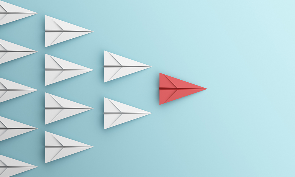 leadership or different concept with red and white paper airplane on blue background. Digital craft in education or travel concept. Mock up design. 3d abstract illustration