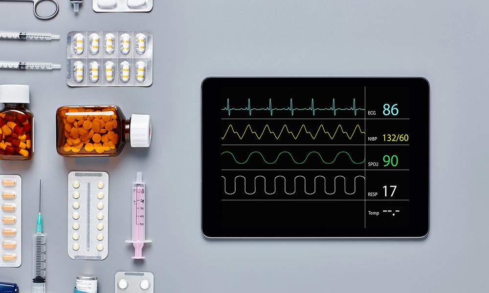 Directly above flat lay flat lay shot of digital tablet with various medical equipment. Medicines are placed with syringes and asthma inhaler. Computer screen is displaying pulse trace on gray background. Knolling concept.